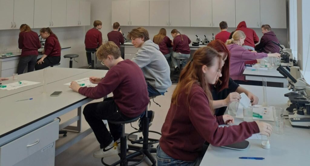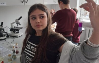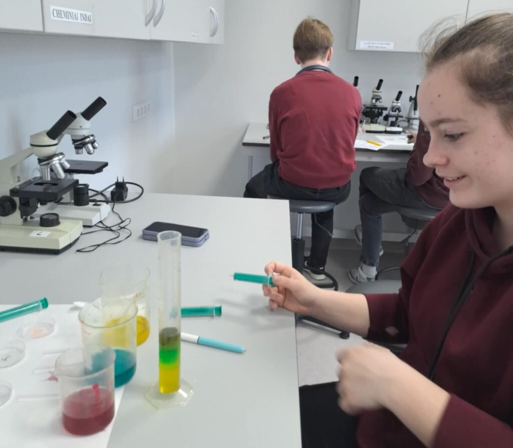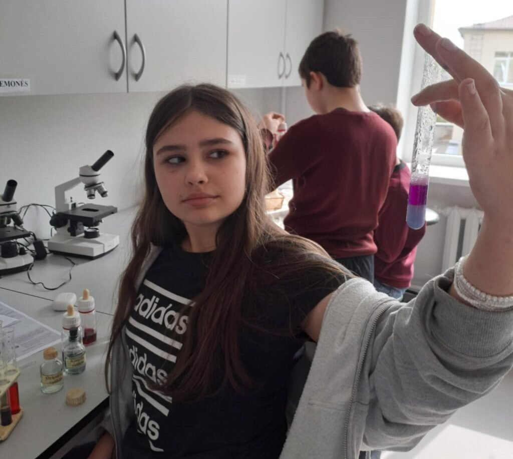 Gamtos mokslų laboratorijoje balandžio 14 d. vyko STEAM pertrauka „Įdomioji chemija“. Pertraukos metu 5-6 klasių mokiniai aktyviai dalyvavo tiriamojoje veikloje, naudodami buities tirpalus ir gamtinius indikatorius. Jie naudojo kinrožės arbatą ir raudongūžio kopūsto tirpalą, kad nustatytų tirpalų rūgštingumą ar šarmingumą. Įvairius buities skysčius – actą, sodos tirpalą, orkaičių ir dušo valiklį bei kt. – mokiniai lašino į indikatorinius tirpalus. Stebėdami spalvų pokyčius, jie užfiksavo, kaip indikatoriai reaguoja į skirtingas chemines aplinkas. Veikla buvo ne tik informatyvi, bet ir vizualiai įdomi, sukėlusi daug smalsumo bei džiugių emocijų.